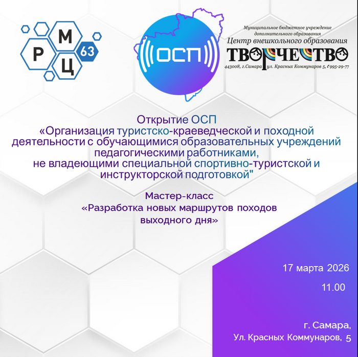 Распоряжением Министерства образования и науки Самарской области от 27.01.2026г. № 71-р МБУ ДО «ЦВО «Творчество» г.о. Самара присвоен статус областной стажерской площадки в системе дополнительного образования детей Самарской области по теме «Организация туристско-краеведческой и походной деятельности с обучающимися образовательных учреждений педагогическими работниками, не владеющими специальной спортивно-туристской и инструкторской подготовкой».