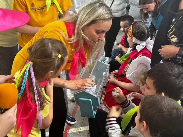 Гостей Центра встречали ростовые куклы, создавая атмосферу радости и веселья и приглашая на увлекательное путешествие по станциям с веселой клоунессой Клёпой.