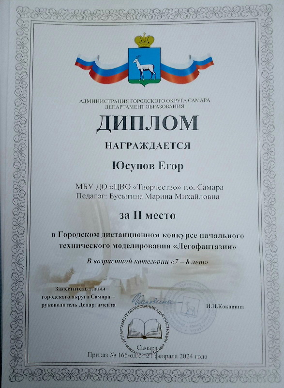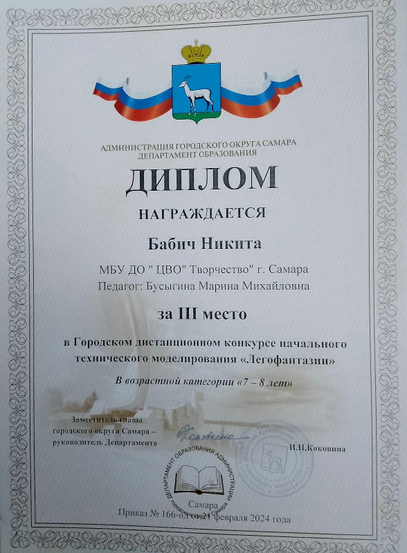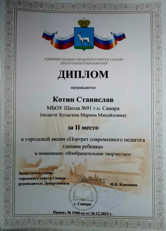 Бусыгина Марина Михайловна, педагог первой квалификационной категории, педагогический стаж 26 лет, награждена Дипломом Департамента образования Администрации городского округа Самара.