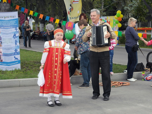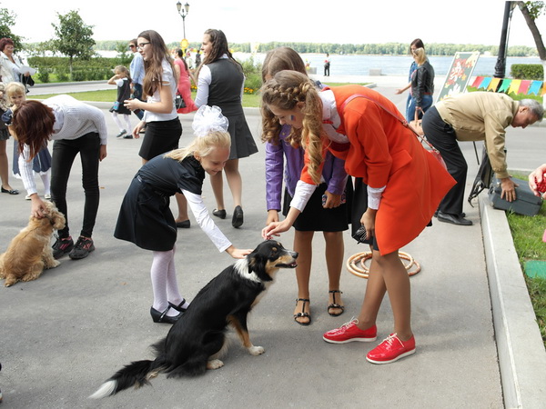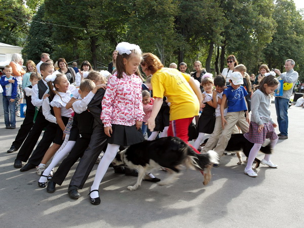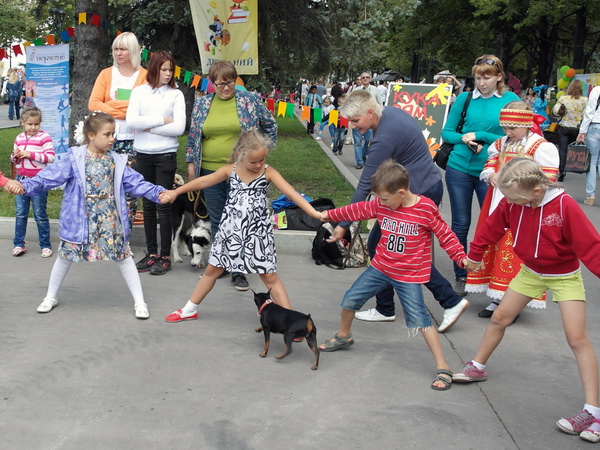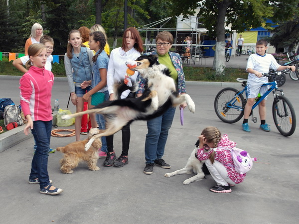 Воспитанники детского клуба любителей собак «Унипес» и их четвероногие питомцы собрали вокруг себя многочисленных зрителей. Всем хотелось увидеть, как собачки считают, играют со зрителями в мяч, прыгают через обруч. Все желающие могли себя попробовать в роли дрессировщика.