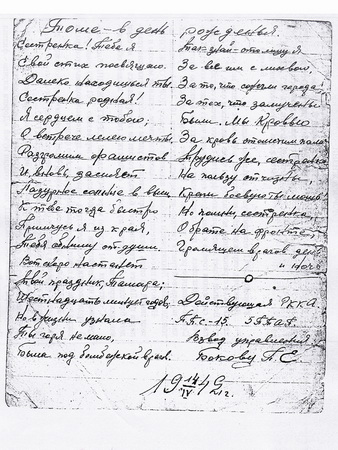 На патефоне времен Великой Отечественной войны, одном из экспонатов музейной комнаты, проигрывались старые пластинки. Под мелодию песни «Почта полевая» было прочитано фронтовое письмо Бокова П.Е., адресованное своей сестре Павловой Т.Е. , написанное именно 14 апреля, но только 69 лет назад, в далёком 1942 году.