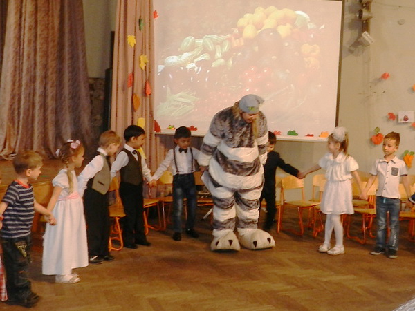 Нарядно украшенный зал, веселая музыка встречали детей и родителей. Ребята вместе с Осенью отправились в сказочную деревню Простоквашино, чтобы помочь Матроскину и Шарику собрать богатый урожай овощей и фруктов.