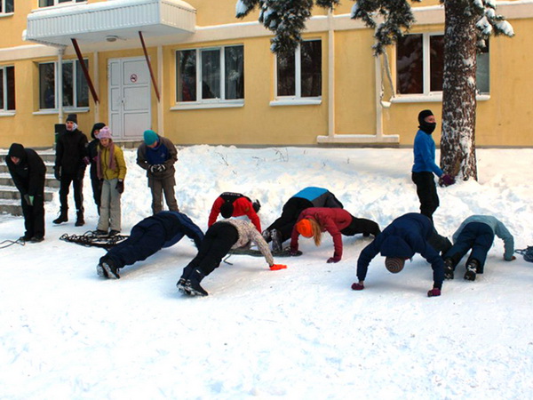 Каждый день, несмотря на мороз, начинался с утренней зарядки на свежем воздухе. Потом пробежка, разминка, веселые старты, спецбеговые упражнения и, конечно, умывание снегом.