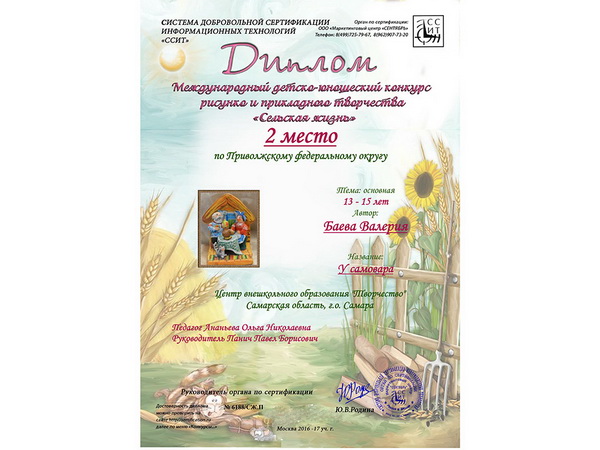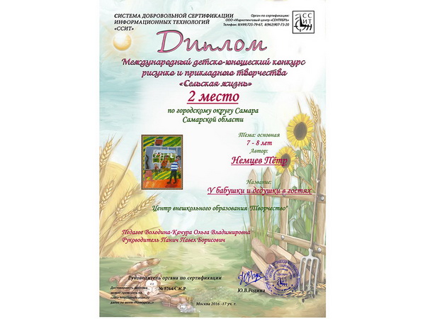 - Немцев Петр - Изостудия «Палитра» (педагог Володина – Качура О.В.) награждена дипломом за 2 место по Самарской области;