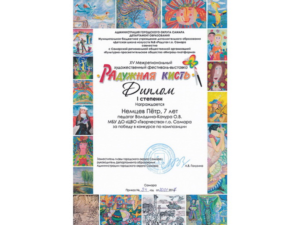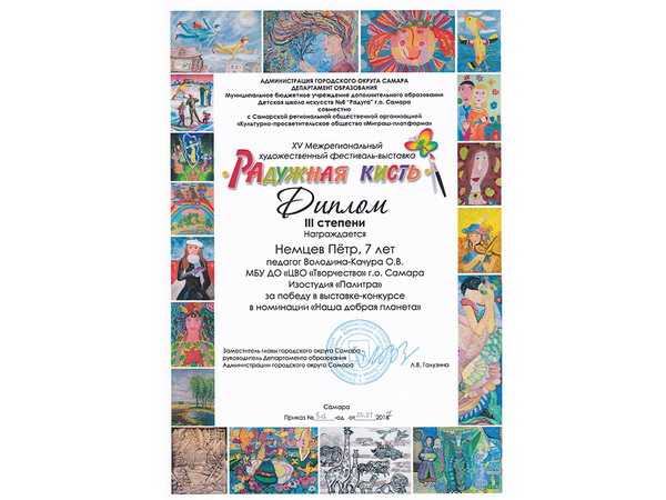 Немцев Пётр стал победителем в возрастной категории от 7 до 9 лет учащийся изостудии «Палитра». За свою работу «Жар Птица» Петя был удостоен I места.