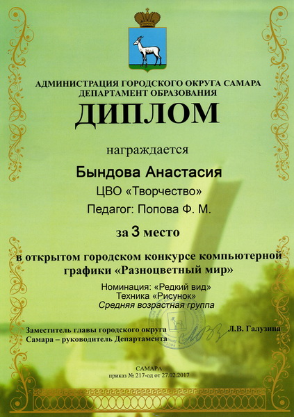 - Диплом за III место в номинации «Редкий вид» - Бындова Анастасия, 11 лет