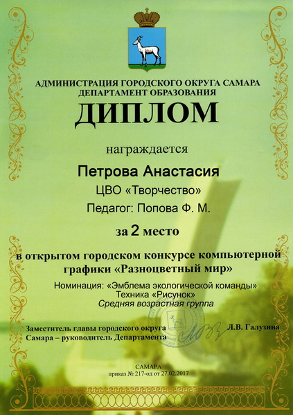 - Диплом за II место в номинации «Эмблема экологической команды» - Петрова Анастасия, 11 лет