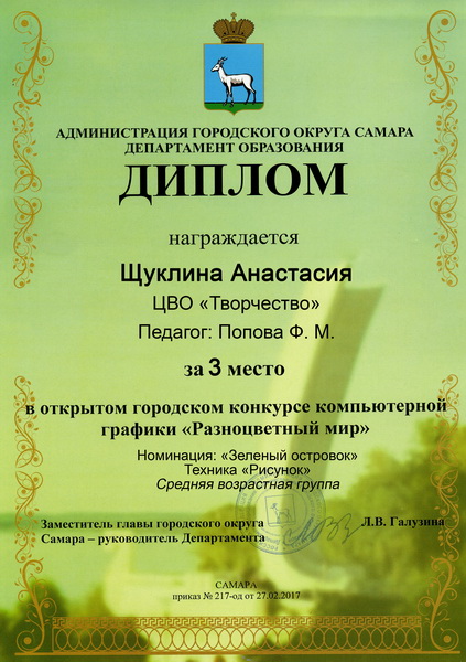 - Диплом за III место в номинации «Зеленый островок» - Щуклина Анастасия, 14 лет