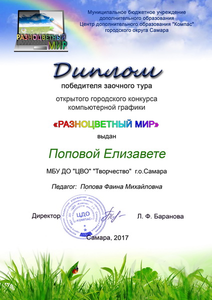 - Диплом лауреата заочного тура в номинации «Наши соседи» - Попова Елизавета, 8 лет