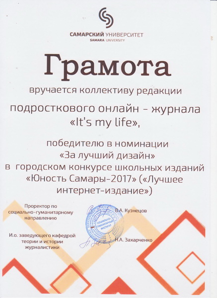 Редакция подросткового онлайн журнала «It’s my life» получила награду городского конкурса школьных изданий «Юность Самары - 2017» в номинации «Лучшее интернет-издание».