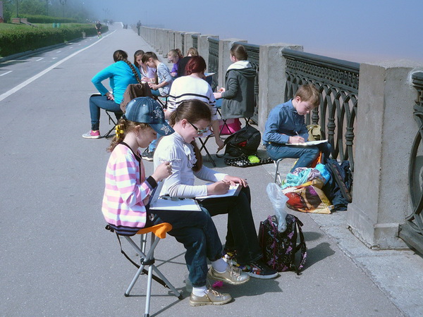 Хорошему настроению и продуктивной работе юных художников не мешала даже погода. Пленэр в загородном парке и в сквере на улице Полевой сопровождался холодным и порывистым ветром, по небу грозно ходили грозовые тучи. На набережной ребята рисовали в самом сердце тумана. Солнечная и тёплая погода порадовала только в последнюю неделю пленэра.