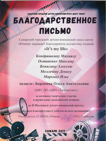 Чаусова Ольга Владимировна, преподаватель кафедры журналистики АСИ СамГТУ, при подведении итогов особо выделила работу редакции онлайн журнала "It's my life" и, в частности, Михаила Кондрашкина, похвалив правильность написания статьи и высокую информативность текста.