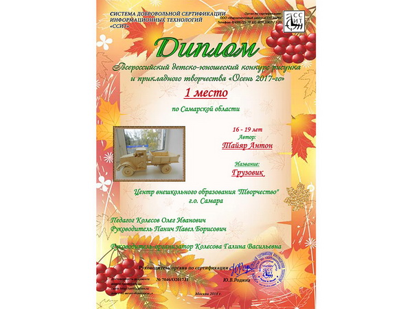 Миронов Степан, Самсонов Владимир, Тайяр Антон и Зайченко Сергей, учащиеся «Мастерской деревообработки «Интерьер» (педагог Колесов О.И.), в техниках выпиливания и художественной росписи по дереву для конкурса изготовили работы «Ежик с яблоками», «Листочки. Подставка», «Енот с грибами», «Грузовик».