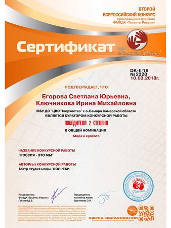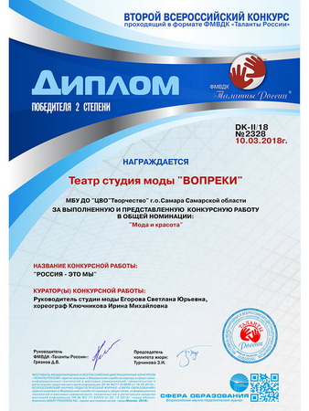 Коллекция «РОССИЯ – это МЫ!» награждена Диплом 2 степени в общей номинации «Мода и красота».