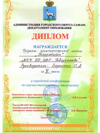 - Группа компьютерной школы «Террабайт» (руководитель Боронина О.А.) получила III место за мультфильм «Новогодняя Золушка».