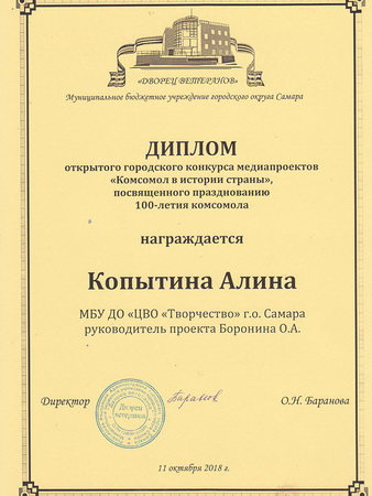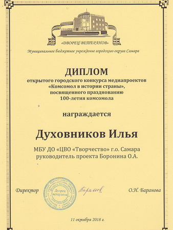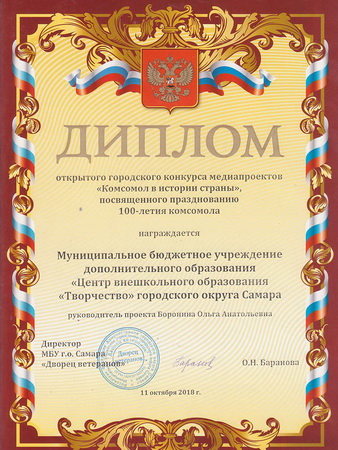 Учащиеся компьютерной школы ЦВО «Творчество» Алина Копытина, Илья Духовников и Иван Теняев, вместе с руководителем О.А.Борониной, оказались на этом мероприятии по приглашению ветеранской организации для вручения наград за победу в творческом конкурсе «Комсомолу 100 лет».