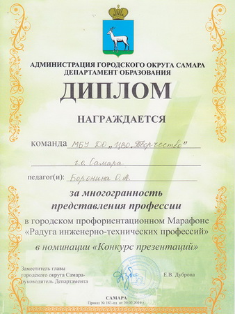 Итогом фестиваля было награждение победителей в различных номинациях. Команда ЦВО «Творчество» в составе Ильи Духовникова и Ивана Теняева получила дипломы «за владение материалом и полноту раскрытия профессии» и «за многогранность представления профессии». Это заслуженная награда за серьезную работу ребят и владение программой Power Point.