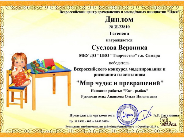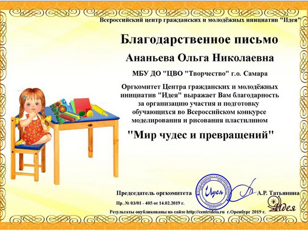 Всероссийский конкурс моделирования и рисования пластилином «Мир чудес и превращений» проходил с марта по апрель 2019 г. Организатором конкурса стал Центр гражданских и молодёжных инициатив «Идея» г. Оренбурга.