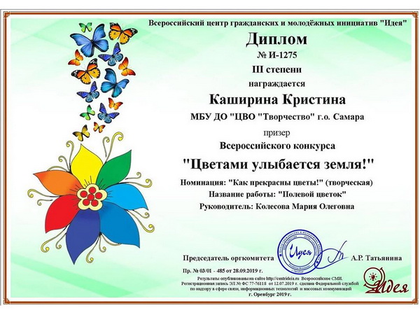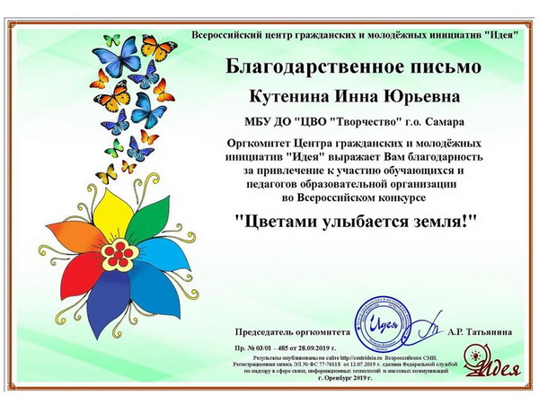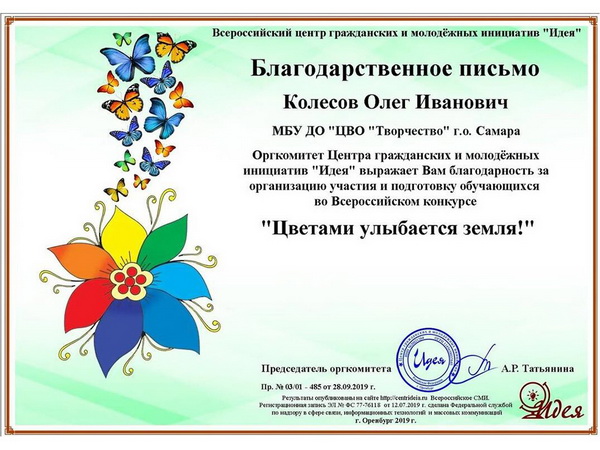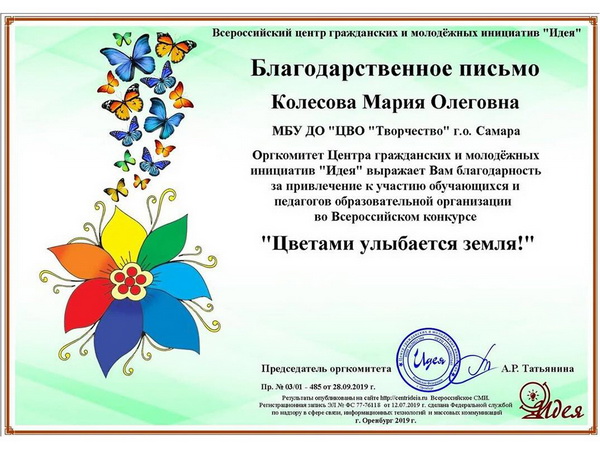 Педагоги: Колесова М.О., Кутенина И.Ю. и Колесов О.И. награждены благодарственными письмами Всероссийского центра гражданских и молодежных инициатив «Идея» за участие в организации и подготовку участия победителей.