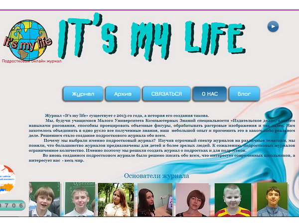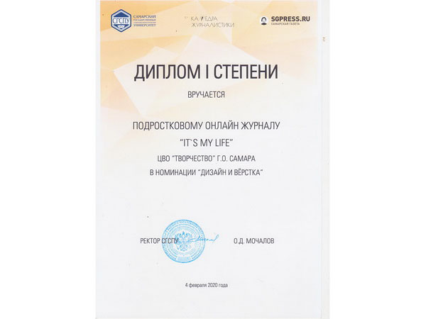 Подростковый онлайн журнал «It’s my life» ЦВО «Творчество» был заявлен в номинации «Верстка и дизайн», получил только положительные отзывы жюри и был награжден дипломом за I место. Поскольку участники редакции журнала занимаются информационными технологиями и, в частности, компьютерным дизайном, то полученный диплом является высокой оценкой знаний и умений учащихся, приобретенных на занятиях в Центре.