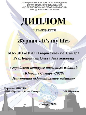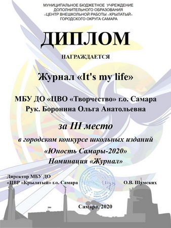 По итогам конкурса подростковый онлайн журнал «It’s my life» ЦВО «Творчество» (руководитель Боронина Ольга Анатольевна) награждён двумя дипломами: дипломом за 3 место в номинации «Журнал» и диплом в номинации «Самое оригинальное издание».