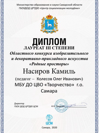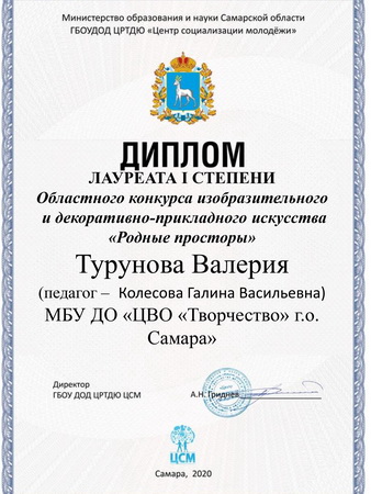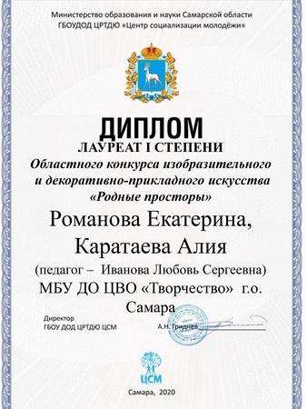 Учредителем областного конкурса изобразительного декоративно – прикладного искусства «Родные просторы», проходившего с февраля по май 2020г. стало Министерство образования и науки Самарской области, организатор фестиваля - «Центр социализации молодежи».