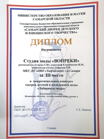 Коллекция, представленная в номинации костюм-художественная идея, стала победителем и награждена дипломом лауреата III степени, за творческий подход в создании коллекции и активное участие в конкурсе.