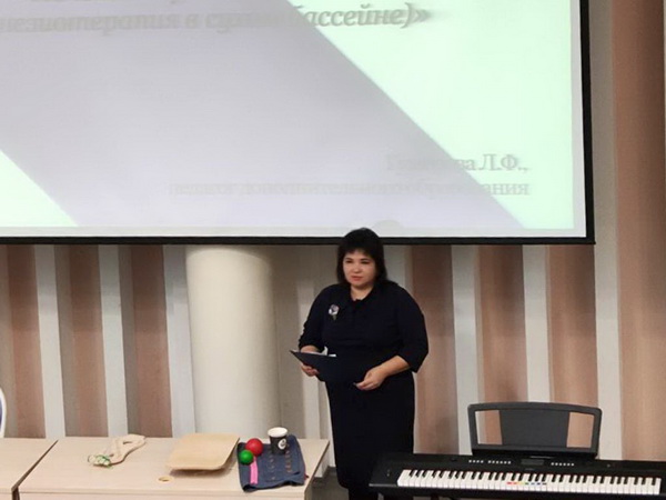 Гумеровой Л.Ф., которая выступала в номинации «Молодой специалист», на конкурс был представлен план-конспект занятия «Лечение через движение» (кинезиотерапия в сухом бассейне), проводимого в рамках реализуемой ей адаптированной дополнительной общеобразовательной общеразвивающей программы.