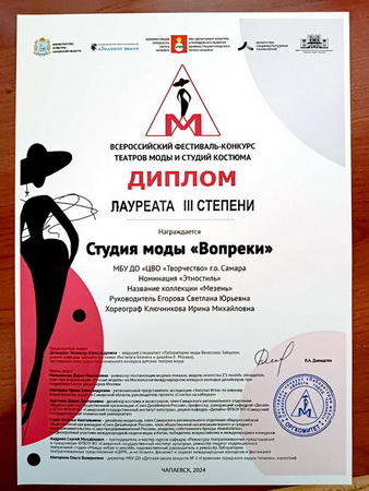 Коллекция Студии моды «Вопреки» ЦВО «Творчество, представленная на конкурс в номинации «Этностиль», стала победителем и награждена Дипломом ЛАУРЕАТА III степени.