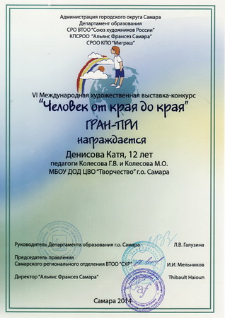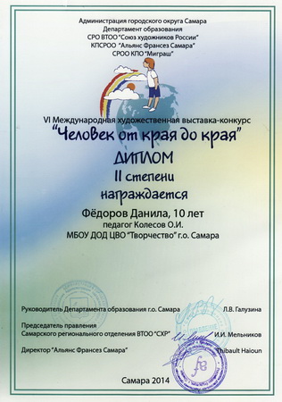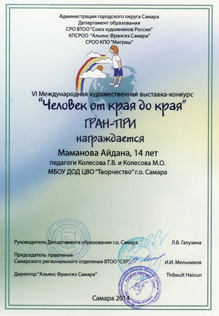 25 апреля 2014 г. в ДШИ № 8 «Радуга» состоялось подведение итогов и награждение победителей VI Международной выставки – конкурса «Человек от края и до края…». Воспитанники МБОУ ДОД ЦВО «Творчество» г.о. Самара завоевали Гран – при конкурса, а также стали победителями 2 и 3 степени.