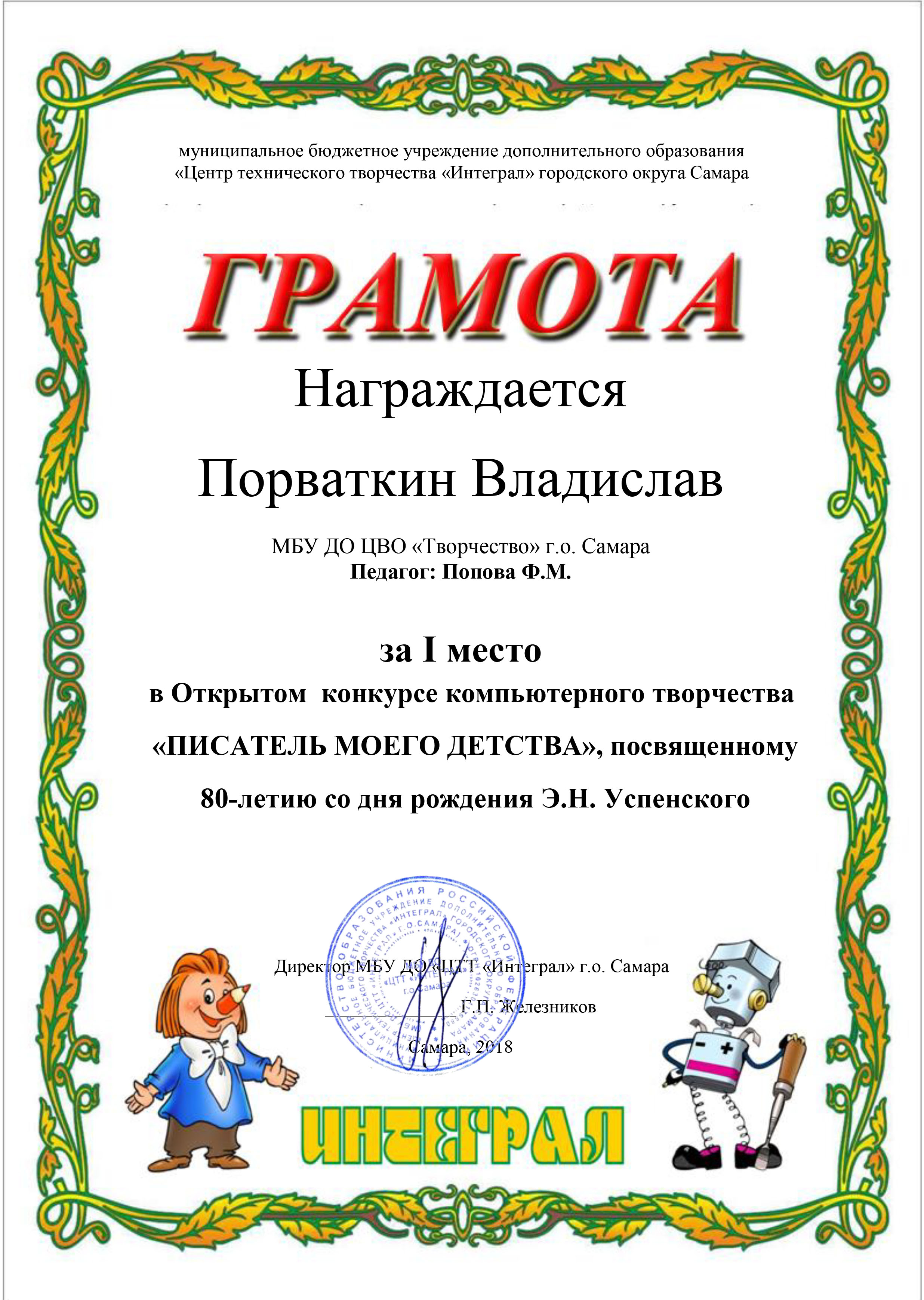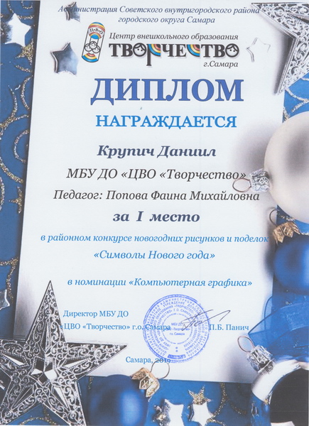 Автор программы и руководитель детско-юношеского объединения «Пользователь ПК» - Попова Фаина Михайловна, педагог дополнительного образования высшей категории; награждена грамотой конкурса профессионального мастерства «Час ученичества» в номинации «Творческая импровизация» за применение метода творческой импровизации на компьютере при обучении воспитанников офисному делопроизводству в рамках спецкурса конкурсной интегрированной программы «Малый университет компьютерных знаний».