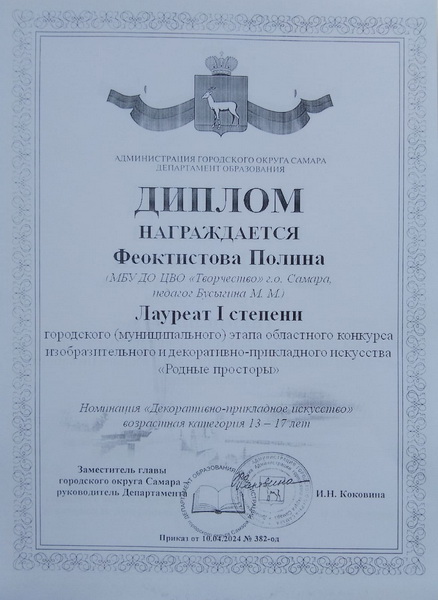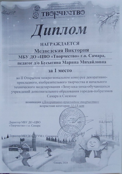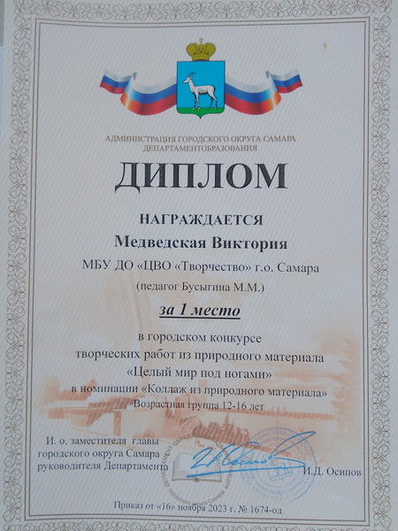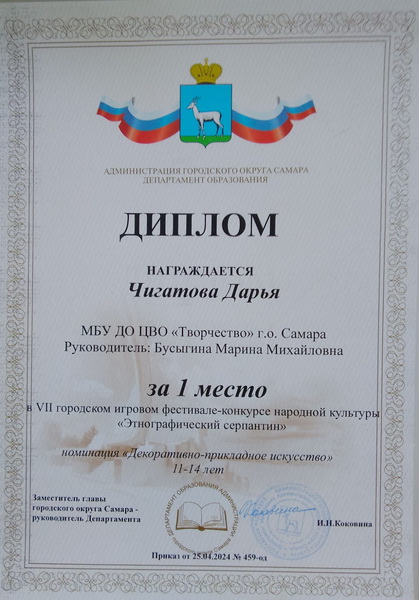 Бусыгина Марина Михайловна, педагог первой квалификационной категории, педагогический стаж 26 лет, награждена Дипломом Департамента образования Администрации городского округа Самара.