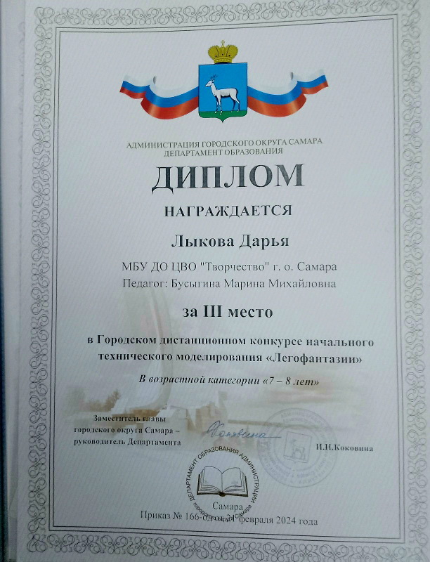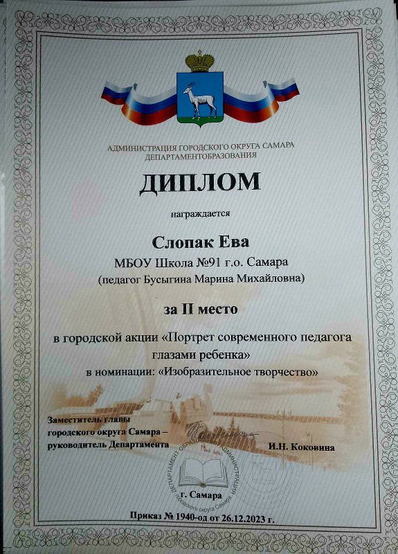 Бусыгина Марина Михайловна, педагог первой квалификационной категории, педагогический стаж 26 лет, награждена Дипломом Департамента образования Администрации городского округа Самара.